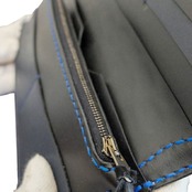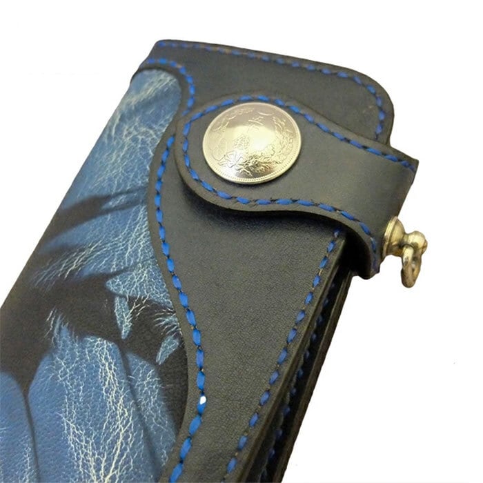 レザーフレームに藍を絞り染めにした鹿革をインレイし、コンチョ付きのフラップ留に。コインケースはファスナー、カード6枚にポケットもあり収納力はバツグン。世界中で黒革でしか入手できない藍染レザーを貴方に。